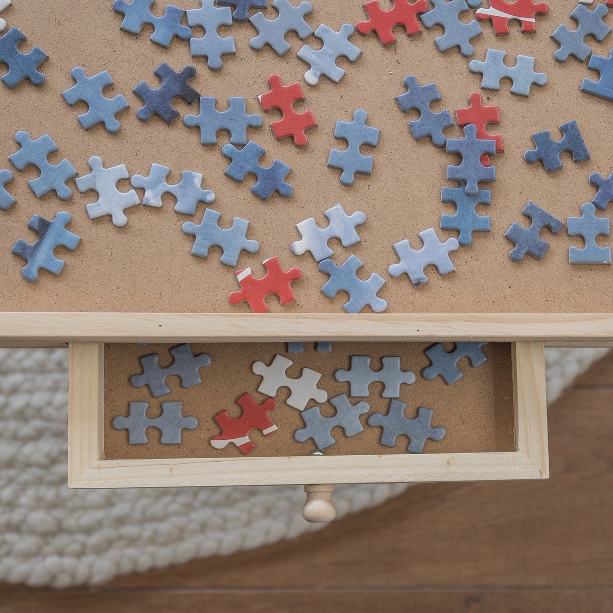 Wat verder handig is aan de puzzelplaat is dat deze heel gebruiksvriendelijk is. Aan werkelijk alles is gedacht! Want naast de lades beschikt de puzzeltafel over een opstaande rand, zodat puzzelstukjes niet van de plaat kunnen vallen. Bovendien maakt de puzzelplank dat hij makkelijk is op te bergen. Met een puzzel van 1500 stukjes kunt u een poosje bezig zijn, dus als u aan het puzzelen bent aan de keukentafel, maakt dit het lastig om de puzzel tussentijds op te bergen. Gelukkig niet met deze puzzelplaat. U tilt de plaat gemakkelijk op en legt hem neer waar hij niet in de weg staat. Zo schuift u hem bijvoorbeeld eenvoudig onder het bed of de bank. Met een hoogte van slechts 4 cm, is de puzzelplaat dus gemakkelijk weg te leggen.