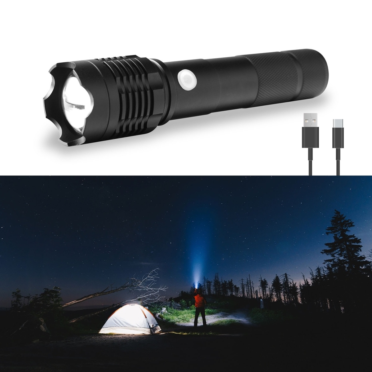 De oplaadbare zaklamp biedt meer dan alleen fel licht; met de knipperlichtmodus kunt u duidelijk signaleren in geval van nood. Deze functie verhoogt uw zichtbaarheid en biedt extra veiligheid wanneer dat nodig is. Daarnaast kunt u schakelen tussen verschillende helderheidsniveaus, zoals fel licht voor maximale zichtbaarheid en een zachtere stand voor subtielere verlichting.
