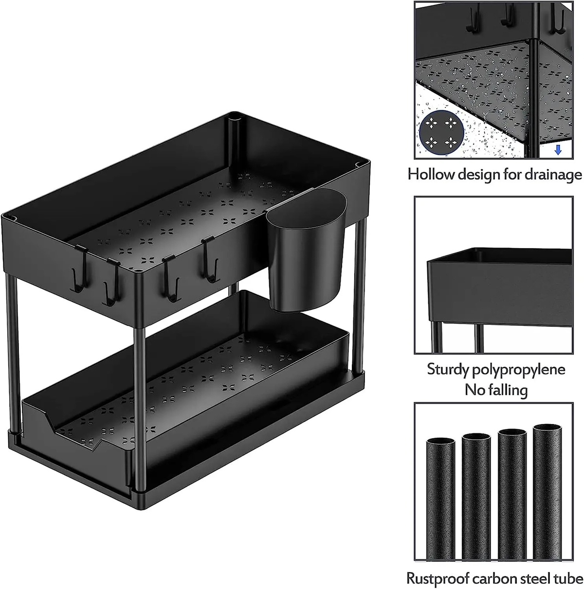 Geen gedoe met schroeven of handleidingen. U klikt de onderdelen eenvoudig in elkaar en binnen enkele minuten staat er een stabiele gootsteen organizer. De vier haakjes en twee losse bakjes zijn perfect voor kleinere spulletjes die u graag binnen handbereik hebt. Door het slimme ontwerp blijft alles netjes staan, zelfs als u de lade volledig uittrekt.